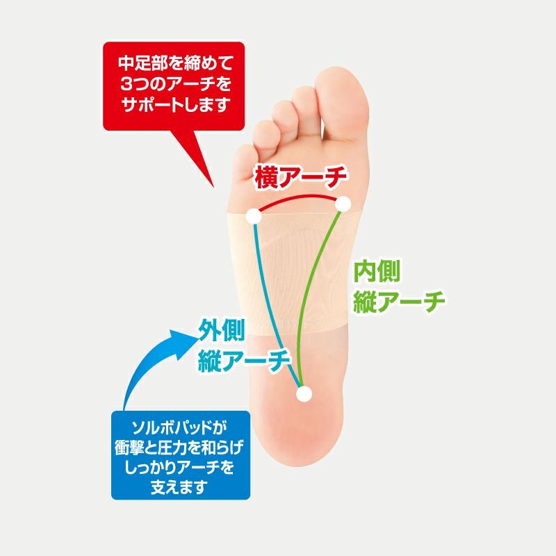 ソルボフットサポーターは、中足部にくるっと巻くだけの簡単装着で足裏のアーチを保持します。