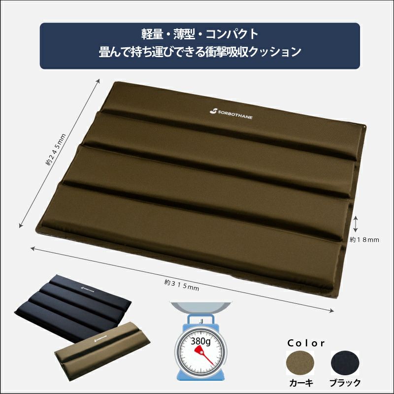 持ち運び便利な折りたたみ体圧分散クッション ソフトな風合いに加えストレッチ性のある防水・透湿素材を使用 ソルボセインと低反発ウレタンでフィット感と体圧分散 重量380gで350ml缶程度の重さ 気軽に持ち運び