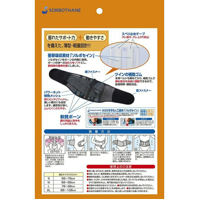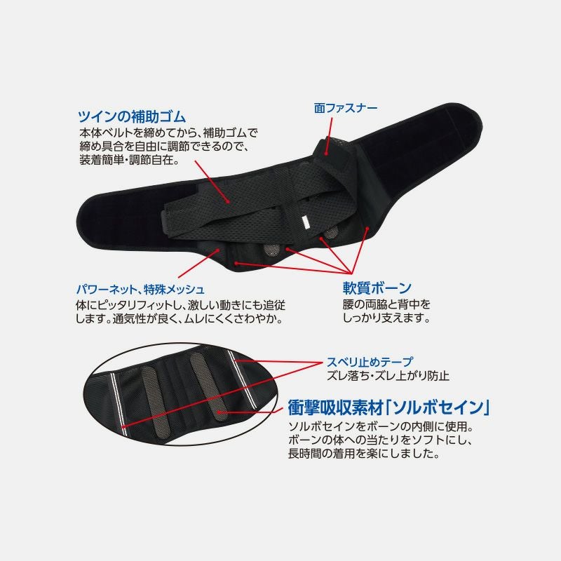 | 特徴 | 1枚でパッと巻ける簡単装着 4本のソルボパッドでサポート 腰側のサポーター高さ18.0cm |