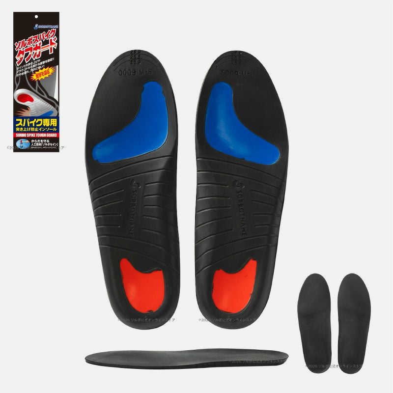 スパイクシューズを履く競技でスパイクからの突き上げを抑制するインソールです。ソルボスパイクタフガードはソルボトゥパッドソルボヒールパッドに衝撃吸収素材ソルボセイン®を使用しスパイクからの突き上げを抑制します。 外側ウェッジ搭載足のひねりやトラブルを軽減します。ヒールカップ形状がスパイクシューズへのフィットを高めます。表生地を使用してないので汚れを簡単に洗い流せます。
