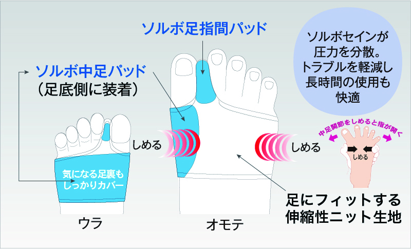 履くタイプの薄手生地サポーター つま先にゆとりのある靴が履けます ソルボ足指間パッドは指に沿った形なので優しくフィット
