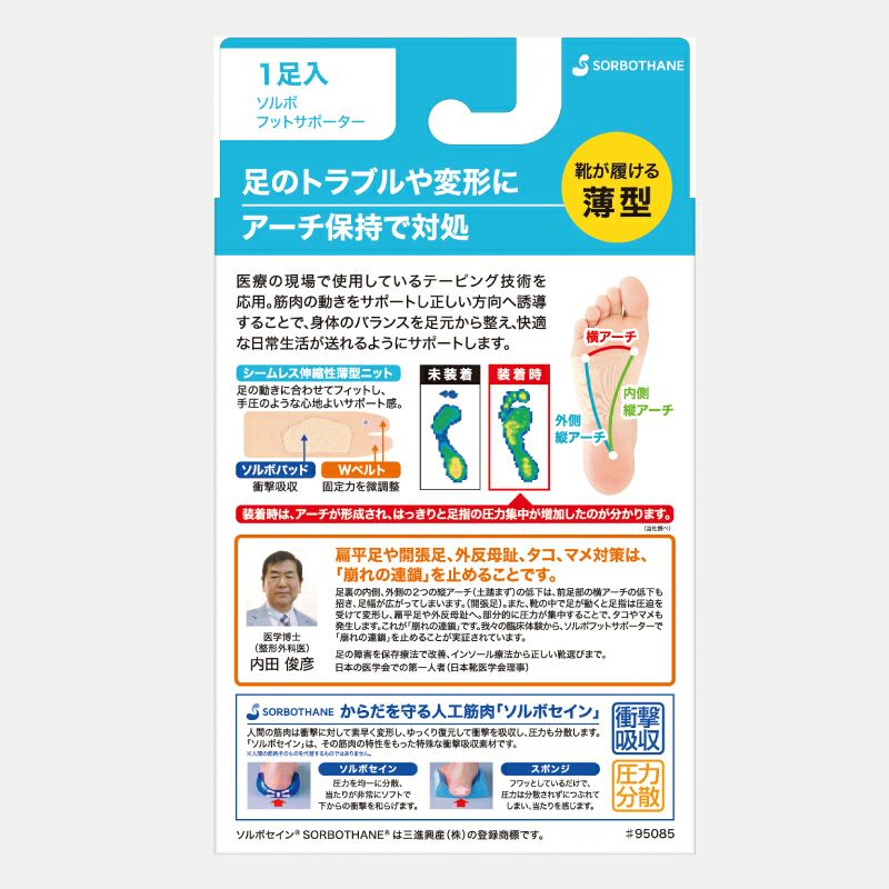 ソルボフットサポーターは特に足の中足部と足のアーチをサポートすることで、バランス良く足全体を使った正しい歩き方が自然に出来るようになります。
