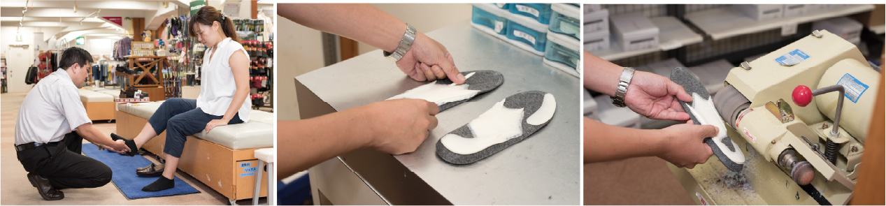 専門資格があるフットケアコントロールトレーナーがお客様の足の状態をカウンセリングし、お客様に最適な足底挿板(インソール)を作製。足のお悩み改善をサポートします。その際に使用されるのがソルボDSISパッドです。