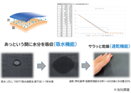 東洋紡の呼吸するポリエステルエクスライブ®を表生地に使用。 吸水性に優れ、水分を拡散するので素早く乾きます。