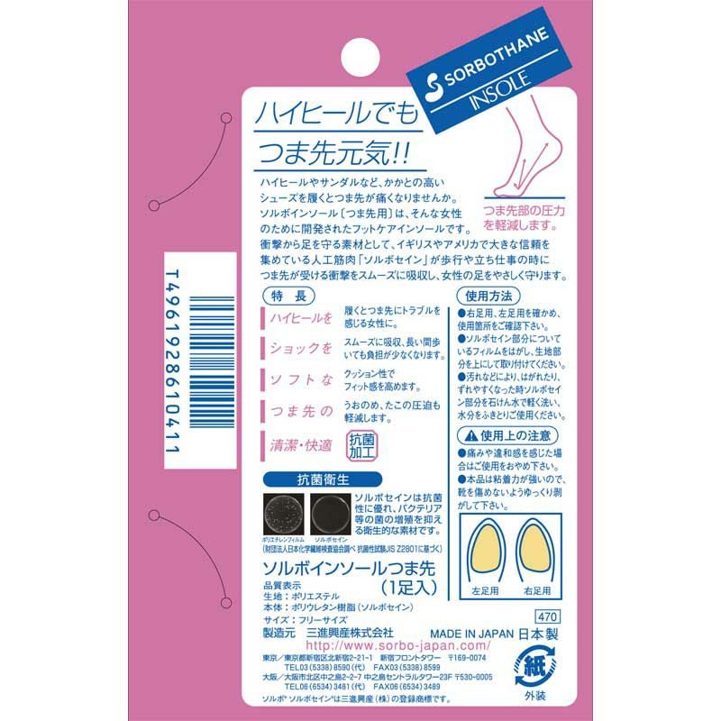 - ソルボセイン側のフィルムをはがし、左右を確認し、靴のつま先部に敷いてください。