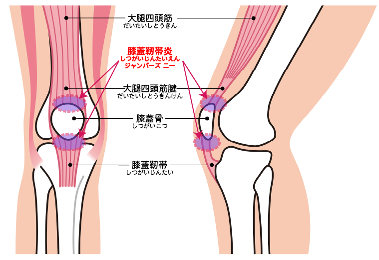 - ジャンプや着地、ダッシュやストップなど筋肉(大腿四頭筋)につながっている靱帯の部分が引っ張られて炎症・痛みを発症させることがあります。