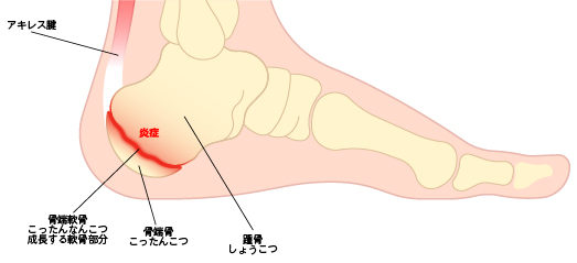 9~14歳の子供に多く発症するスポーツ障害のひとつ。 激しい運動時に『走る、ジャンプ、ステップ等』力を入れることで筋肉はギュッと収縮状態になり、 長軟骨がアキレス腱や、足底筋膜によって、引っ張られ、骨の周りにある薄い膜(骨膜)が炎症を起こし、痛みとなり現れます。
