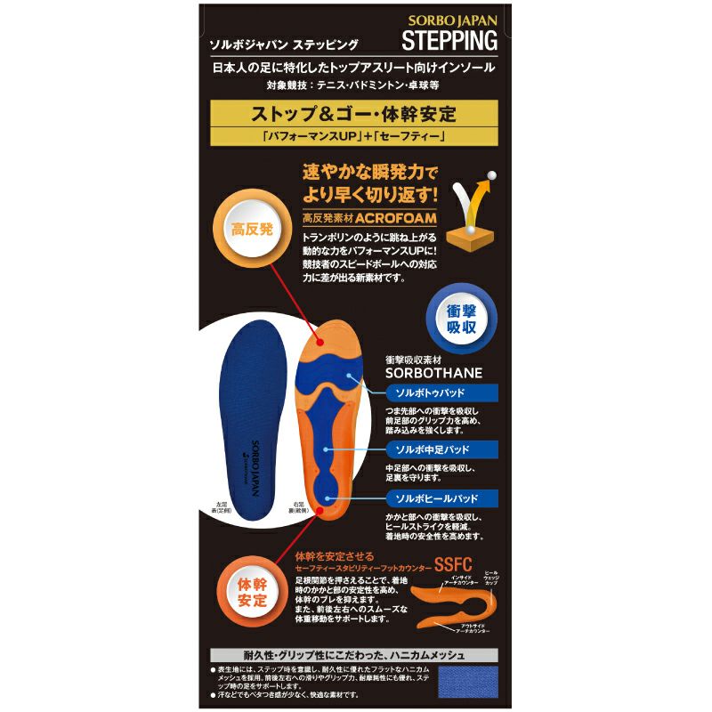 ソルボジャパン ステッピングは、高反発ハイパワークッション素材アクロフォームを使用し、衝撃エネルギーを吸収反発し推進力に変えます。