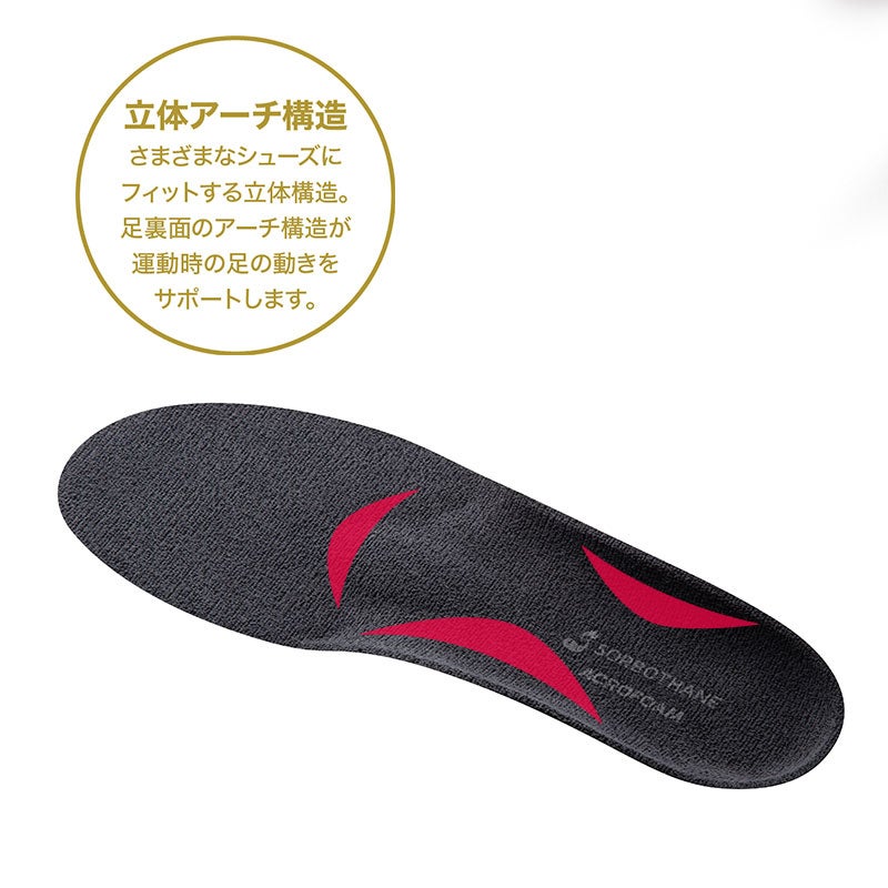 足のアーチに着目した商品は他にもたくさんありますが、唯一無二の衝撃吸収素材であるソルボセインを使用することで、優しくしっかりサポートします。足裏の3つのアーチがしっかりと機能していくことで足は、美しい姿勢や、健康で活動的に暮らす人体の土台になります。