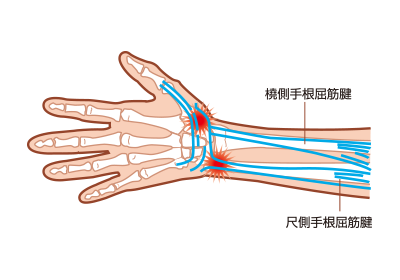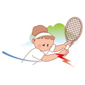 サーブ、スマッシュなどのフォアハンドでの無理なフォームによって衝撃が肘の内側に過剰にかかるために炎症を起こします。ゴルフの際にも発生する肘の障害です。