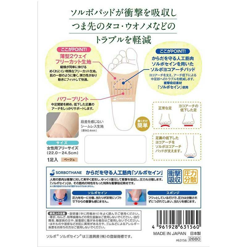 DSIS構造(足裏にある3つのアーチをサポート)とソルボセインをかかと部分に使用した衝撃吸収に優れるハーフインソール つま先にゆとりの無い靴でも装着可能 通気性に優れた人工皮革を表面に使用 24.0~27.5cm 1足入り